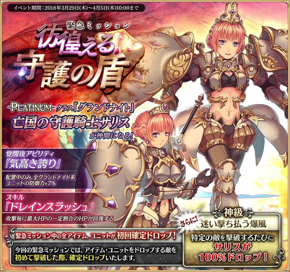 2018年03月29日 千年戦争アイギス:2018年3月29日メンテ明け イベ産グランドナイトの登場 ※続きは前イベ報酬「太公望」の軽い性能バレがあります。 どうも、私です。 アイギス、3月29日のメンテはー。■イベント・『彷徨える守護の盾』の開始周回型、4月5日まで。■復刻イベント・復刻『暗黒騎士団と英霊の守り手』の開始予告4月2日、零時からスタート。・復刻大討伐『千一鬼夜行』の開始4月26日まで。 ―――――― さて、今回のイベントはユニットドロップ形式。 亡国の守護騎士サリス。 クラスは「グランドナイト」 スキルはドレイン系か。 グランドナイトはHPの多いクラス。 割合回復とは相性がいいですね。 正直なところ……。 戦力が充実してるような王子だと、 ブロックできるだけじゃあ出番はまず無いですね。 クラス的にHP、防御がとても高くなるので、 硬いユニットがいないなら育成して損は無いと思います。 ミスゴ受けにも使えそう。 ただ、何だろう。あまりにも普通? 尖りが無さすぎて逆に困るというか。 未実装であるスキル覚醒次第かなー。 まぁ、周回型なうえに最大スキルLv10なのが足を引っ張るのですがね。 続きは太公望。続きを読む タグ :#彷徨える守護の盾