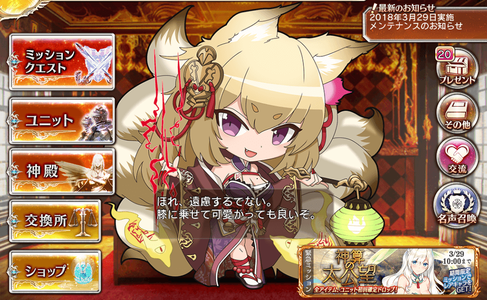 2018年03月28日 千年戦争アイギス:メンテ前の雑談 大討伐リベンジの時が来たか どうも、私です。 画像なしは寂しいんで、最近おいてる副官でも。 膝に乗っけて愛でるのも良いが、 ちびキャラは頭や肩に乗せても良いなー。 と、ちびカヨウの交流を読んで思いましたね。 さて、次メンテでは通常イベントに、 千一鬼夜行の復刻と。 あの大討伐は当時、全討伐できなかった奴。 今回こそは全討伐したいねぇ。 緊急ミッションの方では、グランドナイト。 CC有なのと、メンテ告知で「4月5日まで」とあったので周回型が確定。 面倒だし、程々に済ませる予定です。 クラス、見た目的にもあまり惹かれませんでしたし。 そんな感じでした。
