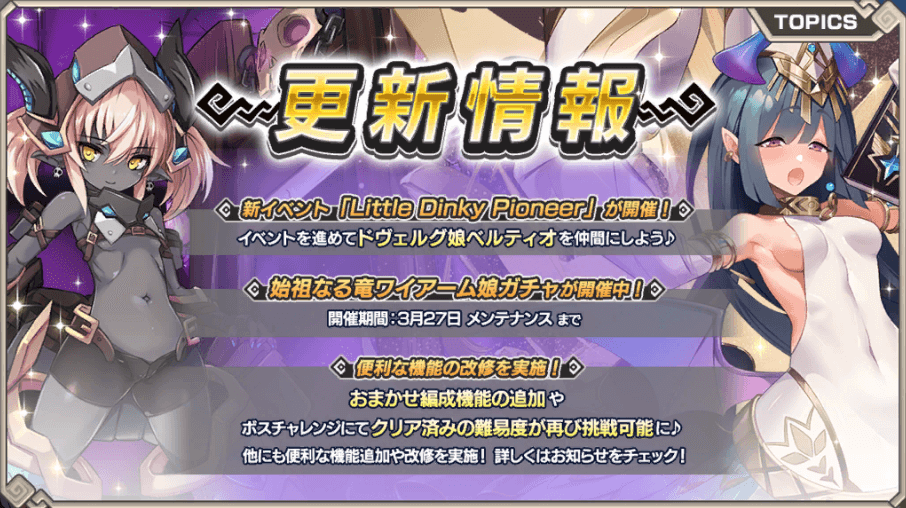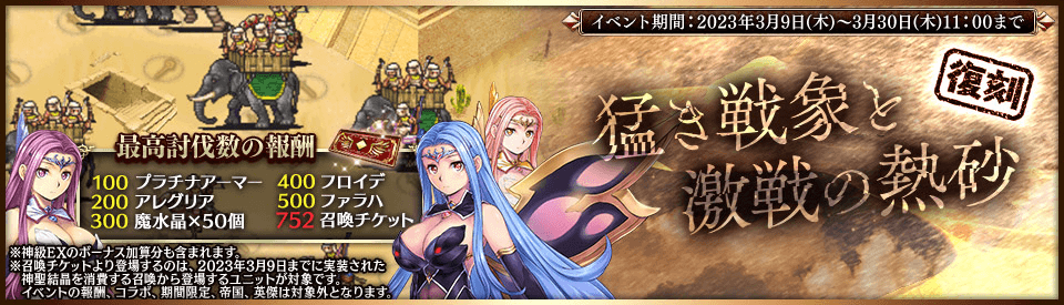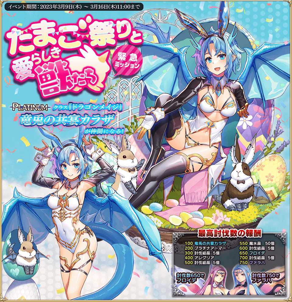 2023年03月09日 アイギス:2023年3月9日メンテ明け ウサギ どうも、わたしです。追記_19:32 あぁ、御城の二の舞……。 さあ今回のメンテ延長はどれぐらい掛かるかなっと。 千年戦争アイギス、 2023年 3月 9日メンテナンス。■イベント・『たまご祭りと愛らしき獣たち』周回:3月 9日~16日■復刻・『守護鳥とぴょんぴょんたまご祭り』兎リーフ:3月 13日~19日・『魔神キメリエス降臨』魔神:3月 9日~16日・『猛き戦象と激戦の熱砂』大討伐:3月 9日~30日・神獣エイエンヘリヤル降臨に 神級EXが追加。 ――――――■課金・結晶お得パック・イースター関連の新規やガチャ復刻・4、5、9周年記念パックの再販 今回は大討伐。 ……最高討伐数、750? EXでもあるのだろうか……。 タグ :#たまご祭りと愛らしき獣たち