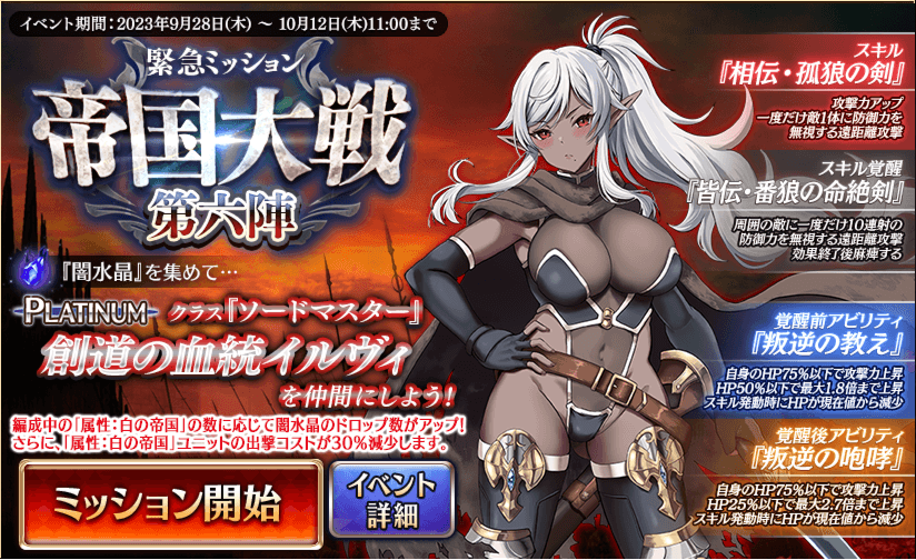 2023年09月28日 アイギス:2023年9月28日メンテ明け 帝国6 こちら千年戦争アイギス。2023年 9月 28日メンテナンス。■イベント・『帝国大戦 第六陣』交換:9月 28日~10月 12日■復刻・『帝国大戦 第一~五陣』第六陣に合わせて復刻。・『ケイティの再演習』大討伐:9月 28日~10月 26日・『魔神ウェパル降臨』魔神:9月 28日~10月 5日 ――――――■課金・帝国プレミアム召喚・帝国大戦記念パック・サポートユニットパック10さて、帝国大戦です。いつも通り、闇水晶を集めて、景品を交換するだけのイベント。イベントユニットは、書いてあることは強そうですが、スキル回転率が悪そうなのが気になる部分。 タグ :#帝国大戦_第六陣