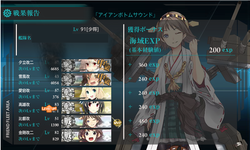 燃料1万、鋼材9千、弾薬8千、バケツ90個ほど消費。支援艦隊は使用せず。