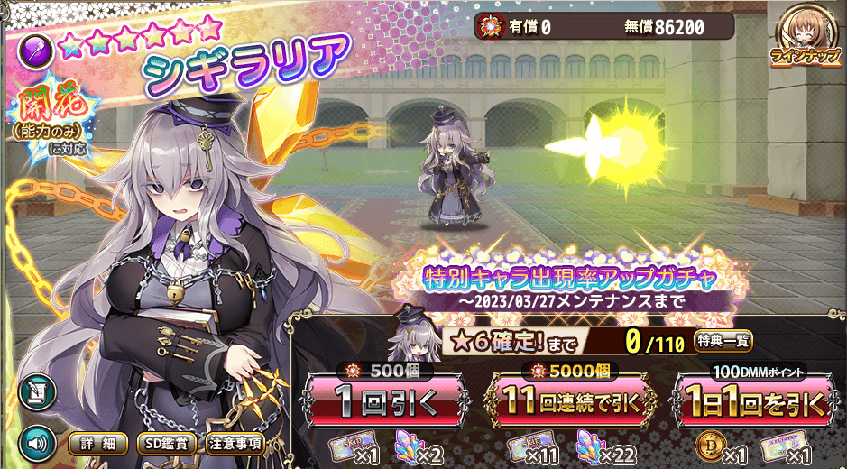 シギラリアの性能については幅広くデバフ取り揃えてあるから活かせる場面あるかなと思ってストーリー見る前に引きに行きましたがまあ現状デバフ上限までかけても焼け石に水気味なのと効果に切れ目があるのがどうしても気になるって感じですかね。