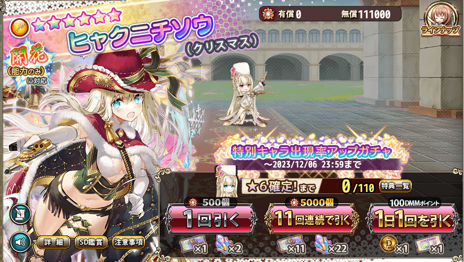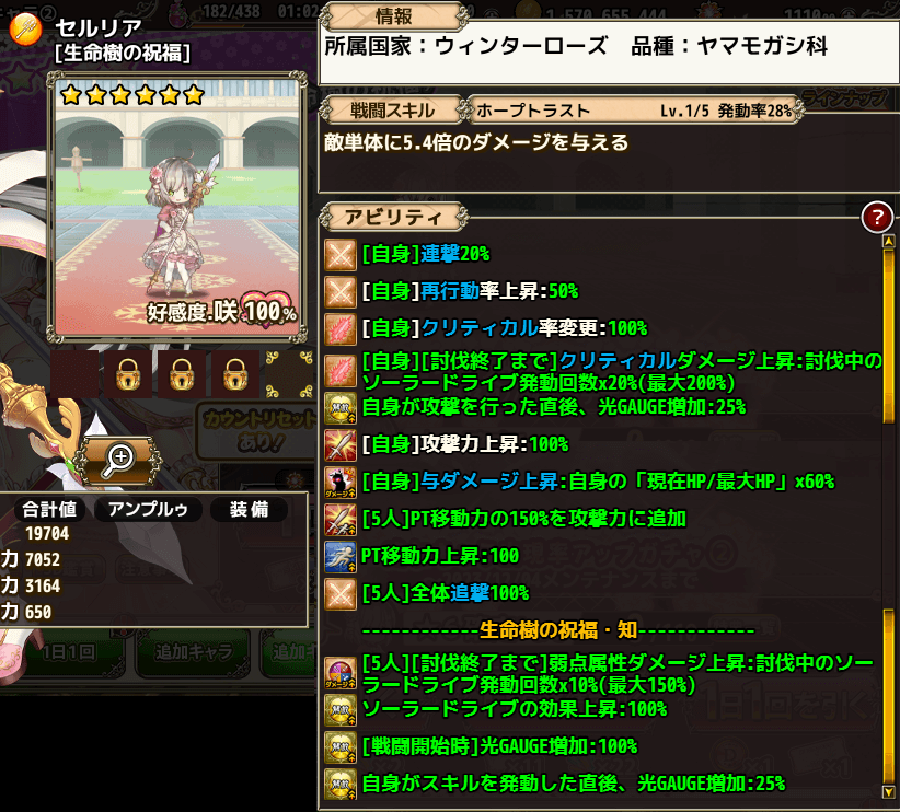 で久々にこれで編成組む気が起きちゃって「通常ヒャクニチ、聖夜ヒャクニチ、生命樹ハナモモ、通常ジュズ、バニカク」という編成組んでフラス倒しましたが..エアプ並みの感想しか出てこない位何起こっているのか分かんなかったです..生命樹ハナモモが聖夜ヒャクニチとかみ合い良い位。