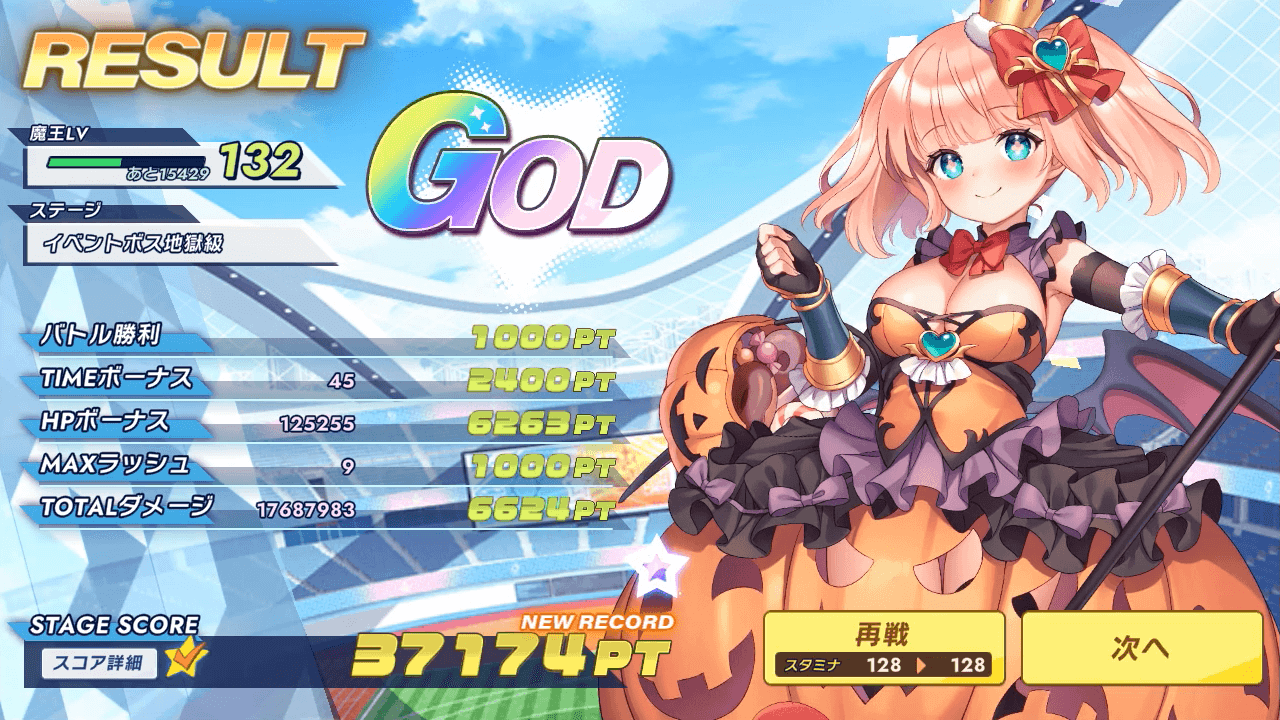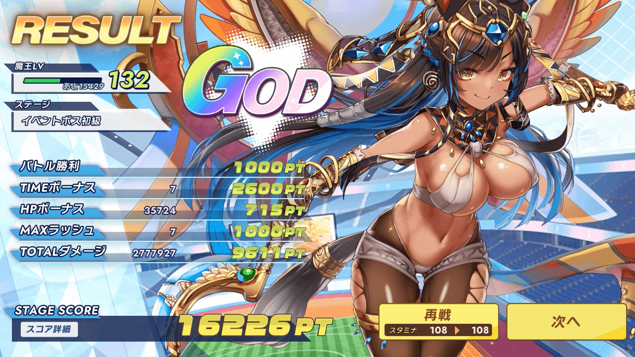 まあスコアアタックやらせるくせにスコア上がる条件を説明してないのは不親切。私はスコア詳細見てのHPボーナスとトータルダメージが青天井かな?と思ってヒールとワンパン必須と考えましたね。