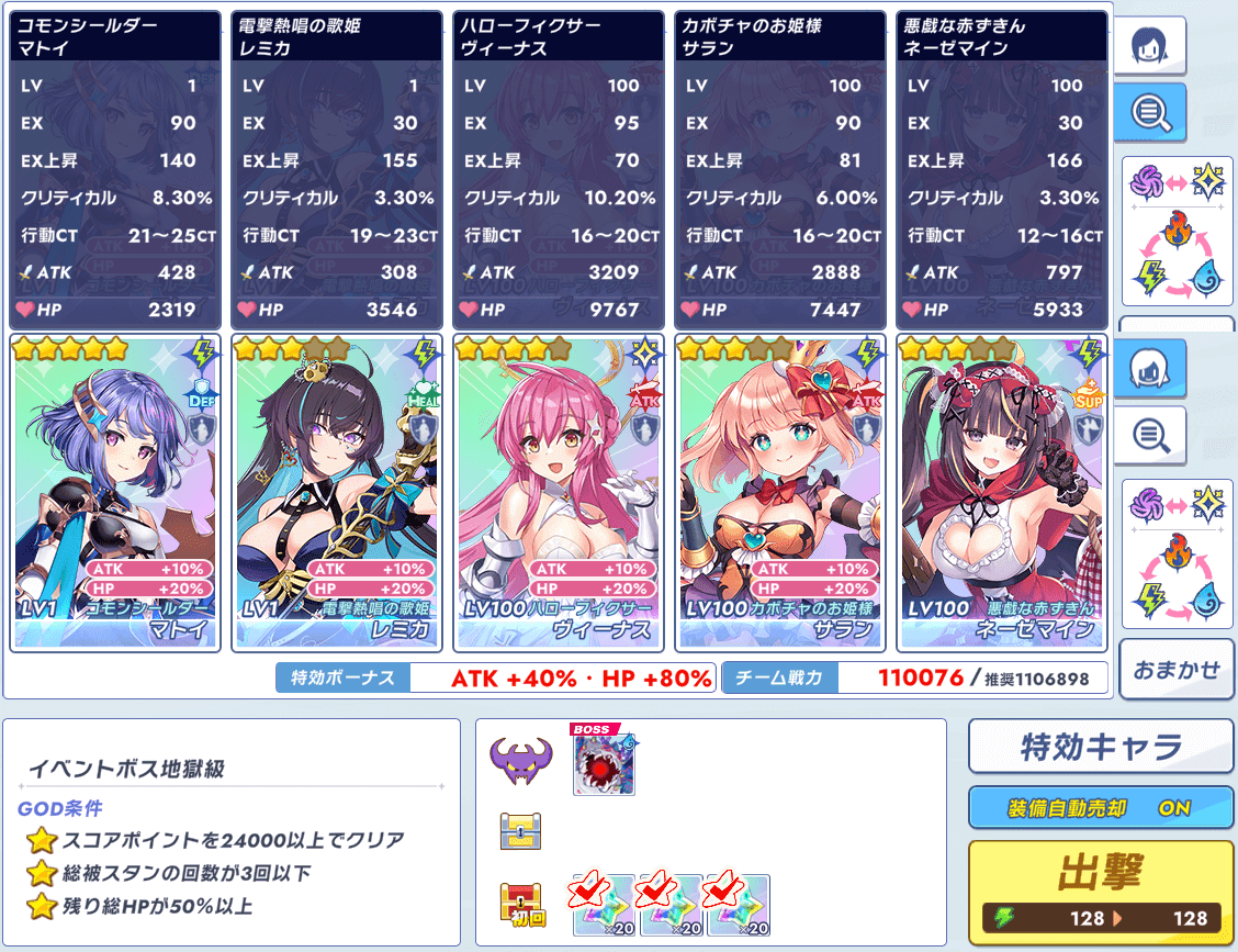 編成はワンパンのハロキャラ2人、ヒールのレミカ居ないので代わりの紅明、HP順でフェリシーと雷ユーリスで攻略しましたが、特定のキャラを選ばされてる感が強いと思った。攻略もヒールしてワンパンするといつもやってる事と何が違うん?な感じ。