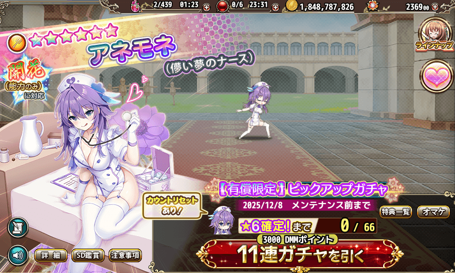 ガチャは有償、イベ金は無い状態が続いてますね。まあ予想通りアネモネでしたが2週間に一回くらいの頻度で挟まってる気がします。人気投票ガチャを小出しに放出してるからでしょうけど、延命措置にしか見えませんね…